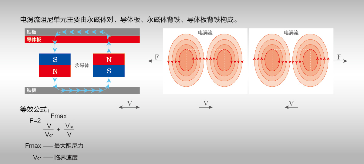 基本原理:當導體板(銅板或鋁板)在兩塊永磁體之間的空氣間隙中沿垂直磁感應強度方向運動時,導體板中產生電渦流。渦流場與磁場相互作用,產生的洛倫茲力將阻礙導體板和磁場之間的相對運動(楞次定理),同時電渦流因導體板中的電阻作用而轉化為熱能耗散掉,產生阻尼效應。當導體板或永磁體與振動結構連接時,導體板上不斷地有電渦流產生,同時結構的動能不斷地轉化為導體板中的熱能,使結構振動逐漸衰減。